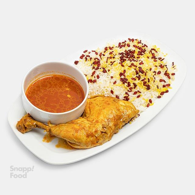 400 گرم ران یا سینه مرغ، ۴۰۰گرم برنج ایرانی همراه با زرشک و زعفران و روغن حیوانی