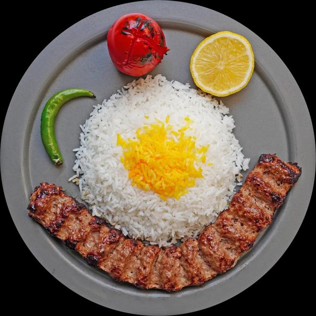 یک سیخ کباب لقمه ۲۲۰ گرمی مخلوط گوسفندی و گوساله، ۴۰۰ گرم برنج ایرانی، دورچین: فلفل کبابی، گوجه کبابی، کره حیوانی